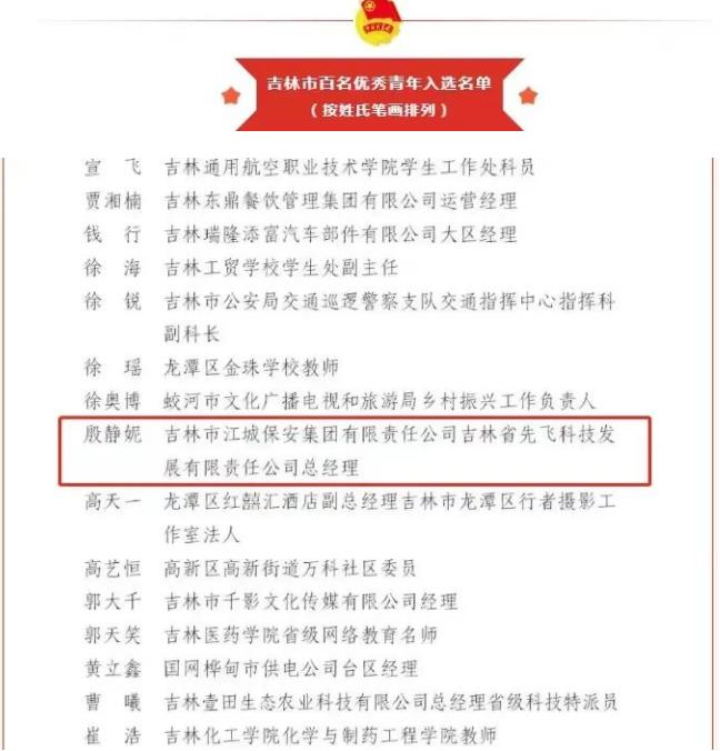 為培養擔當民族復興大任、建設幸福美好吉林的時代新人,挖掘、培樹、宣傳一批具有時代特征和典型意義的先進青年代表,經中報推薦、復核審查、網上投票、評委會評審四個階段,共青團吉林市委、吉林市青年聯合會決定對丁婕等100名優秀青年予以通報表揚,我集團公司吉林省先飛科技發展有限責任公司總經理殷靜妮同志榮獲吉林市百優青年稱號。